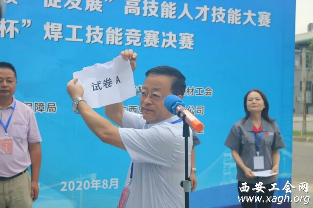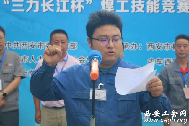 开幕式上,张革斌代表中车西安公司致辞,李胜林现场抽取并展示了竞赛题目。李永军代表裁判员宣誓。西安航天发动机有限公司高级电焊工靳虎平代表参赛选手宣誓。