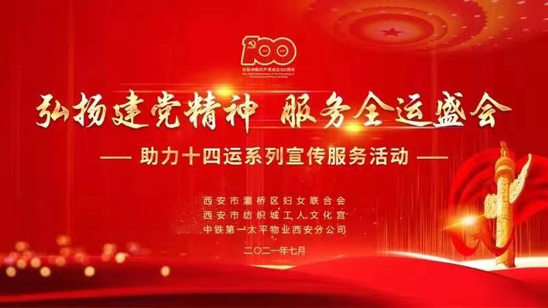 为紧密结合党史学习教育,掀起我宫党史学习教育新高潮,弘扬伟大建党精神,更好地推动“服务十四运 奉献我的城”主题实践活动深入广泛开展,7月8日晚,由纺织城工人文化宫联合灞桥区妇女联合会、中铁第一太平物业西安分公司举办的“弘扬建党精神 服务全运盛会—助力十四运系列宣传服务活动”在中铁缤纷新城小区举行。