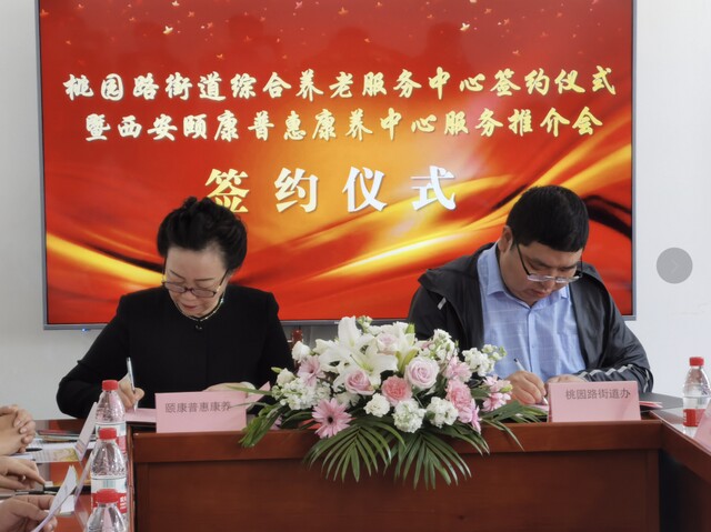 莲湖区桃园路街道办副主任曹禹,西安颐康健康养老产业有限公司负责人李冬玲作为合作双方代表在《战略合作协议书》上签字。(张铜军 李映凯)