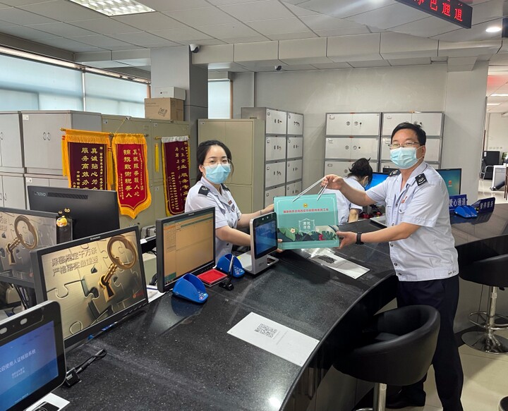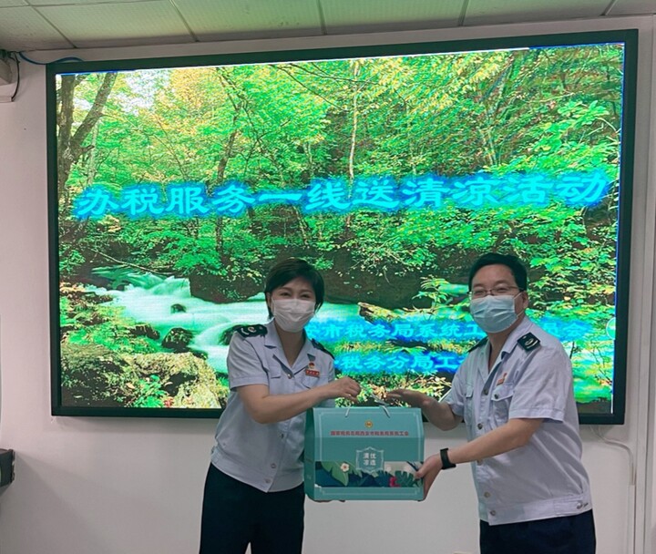 送去清凉的同时,王辉局长提醒和叮嘱一线服务岗位工作人员,注意防暑降温,保重身体。还深入调研并实地查看了重点大项工作任务进展情况,了解两办《意见》落实纳税服务各类任务落实情况和年度重点(创新)任务推进。实地查看了退税减税政策“早退、快退、退稳、退准”精细化纳税服务情况。推行全电发票“大循环”试点,受票扩围试点“预先服”落实情况,以及“随票服”和“网格服”准备和落实进展。听取了办税服务厅落实分局努力打造全国一流站位大企业管理“样板间”目标,推进“双链融合”进一步优化服务环境的思路和建议。