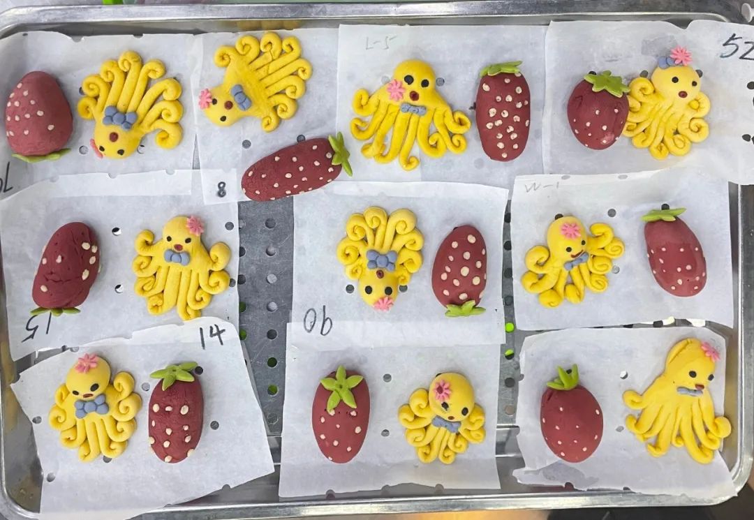 花馍颜色来自各种蔬菜水果,五彩缤纷,形态各异,大家体验了草莓和八爪鱼花馍的制作过程,不仅锻炼了小朋友的动手能力和专注力,更让家长和孩子们一起感受到非遗的魅力。