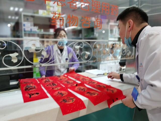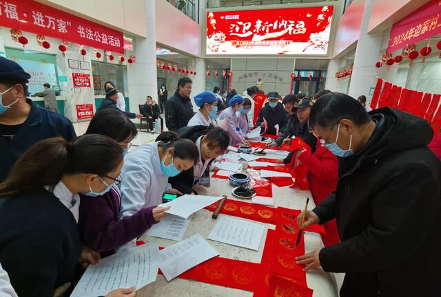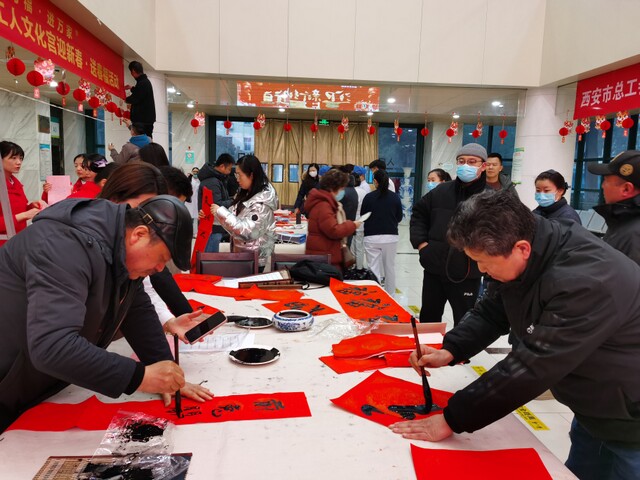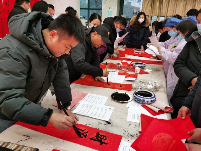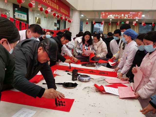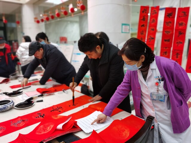陕西省职工文联书法家协会副主席赵刚、西安市美术家协会副秘书长魏育良、西安市职工书画协会副主席车振三、西安市书协中小学书法教育研究会副秘书长王进以及送福小分队的成员们挥毫泼墨,书写着一副副饱含祝福的春联福字。他们书法技艺娴熟,字迹刚劲有力,春联的内容更是寓意吉祥,充满了对医护人员无私奉献精神的赞美和对患者早日康复的美好祝愿。