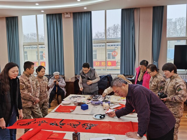 翰墨飘香进军营,春联送福贺新春。为深入贯彻习近平总书记关于双拥工作的重要论述指示批示精神和来陕考察重要讲话重要指示精神,进一步巩固军政军民团结,增进军地军民情谊,推动新时代双拥模范城市建设。2024年2月5日,在春节即将来临之际,西安市边家村工人文化宫送春福小分队走进省军区某干休所开展了“送万福 进万家”迎新春书画进军营双拥文化活动,为老战士、老英雄及全体官兵、家属送上新春的祝福。