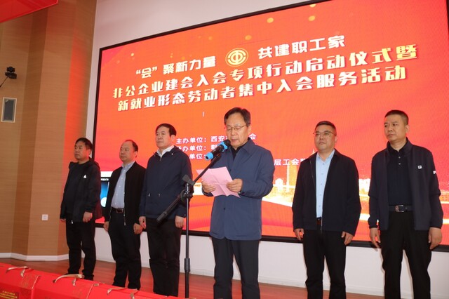 为深入贯彻落实关于维护新就业形态劳动者权益的工作要求,进一步扩大工会组织覆盖面,鄠邑区总工会于2025年4月9日在西安沣京工业园党群服务中心举办“‘会’聚新力量 共建职工家——非公企业建会入会专项行动启动仪式暨新就业形态劳动者集中入会服务活动”。市总工会副主席薛关文、基层工作部部长胡玉震受邀出席,区人大常委会副主任、区总工会主席温文强出席并致辞,活动由区总工会常务副主席李润东主持,全区各级工会干部以及非公企业职工代表、新业态劳动者代表等200余人参加活动。