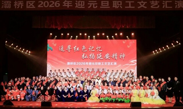 为深入贯彻落实习近平新时代中国特色社会主义思想,大力弘扬延安精神、劳模精神,传承红色基因,赓续红色血脉,12月26日下午,由灞桥区总工会、区延安精神研究会、西安市纺织城工人文化宫共同主办的“追寻红色记忆 弘扬延安精神”灞桥区2026年迎元旦职工文艺汇演在中国航天科技活动中心大礼堂隆重举行。