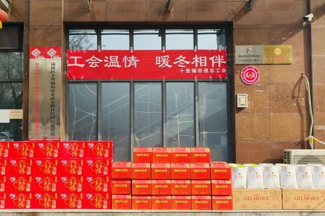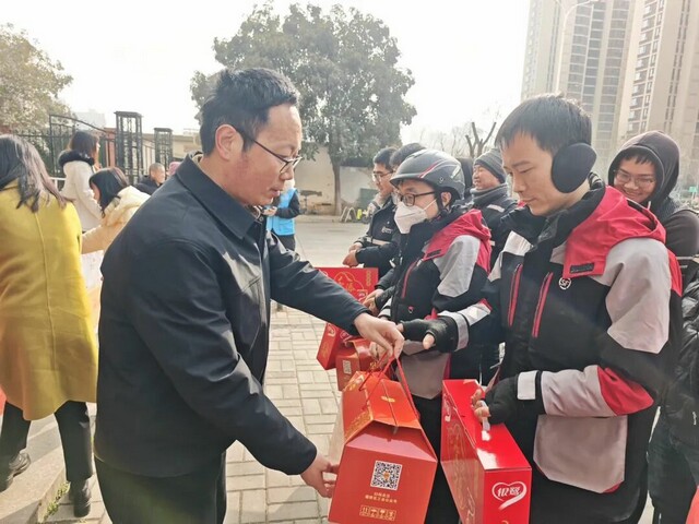 在玄武东路工会驿站门口,来自十里铺街道总工会的60余名户外劳动者——快递员、网格员,正在等候一份特别的节日礼物。工作人员将八宝粥及定制礼包逐一送到户外劳动者手中。考虑到户外劳动者工作时间不固定、常错过饭点,工会特意选择整箱八宝粥作为礼品,既方便携带储存,又能让他们在奔波途中随时补充能量,更能将这份节日祝福带回家,与家人共享。