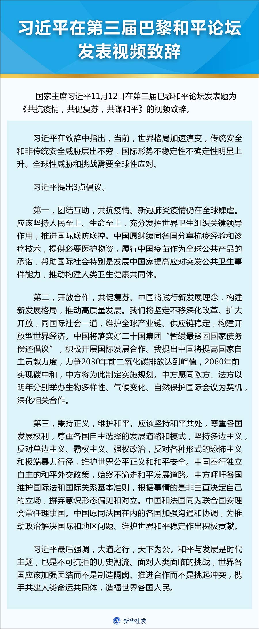 新华社北京11月12日电 国家主席习近平12日在第三届巴黎和平论坛发表题为《共抗疫情,共促复苏,共谋和平》的视频致辞。